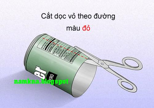 Tiếp theo bạn dùng dao rọc giấy cắt rời phần đáy lon theo đường màu đỏ như hình. Cố gắng tránh làm bẹp vỏ.